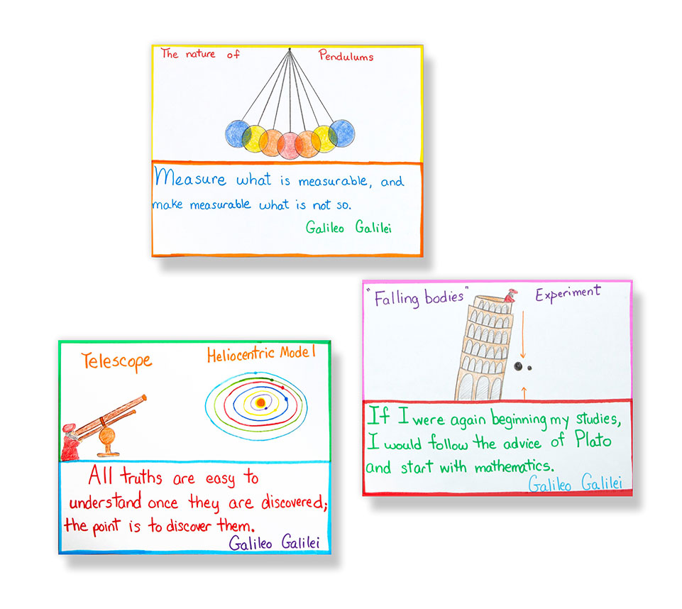 Galileo also wrote many words of wisdom about the pursuit of scientific truth. Ask students to look up some of his inspiring quotes. Then have them create a info card of one of his inventions or laws and perhaps find a quote to pair it with.