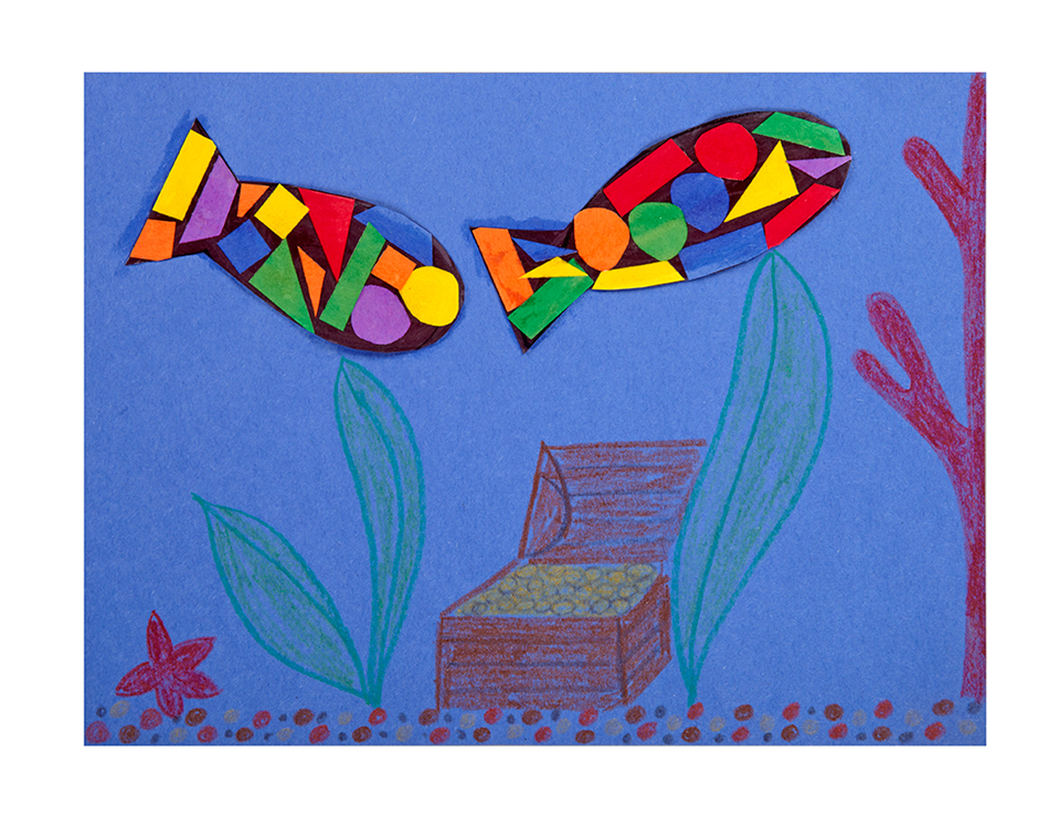 Have students cut various geometric shapes out of brightly colored paper. Then have them draw two or three fish shapes on a separate piece of paper and cut those out. Ask them to arrange the cut-out shapes on the fish cut-outs and glue them on.