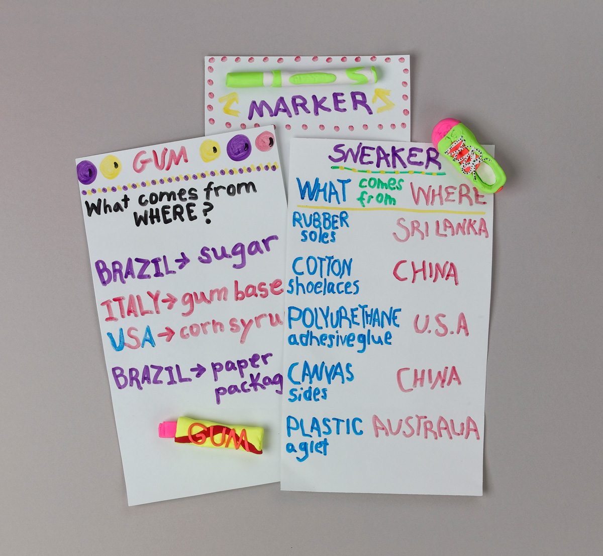 Have students investigate where certain products come from and then document their findings in a colorful way. They could list the products and their source, then add illustrations as well as small models of the product made out of Model Magic that can be glued onto the lists.