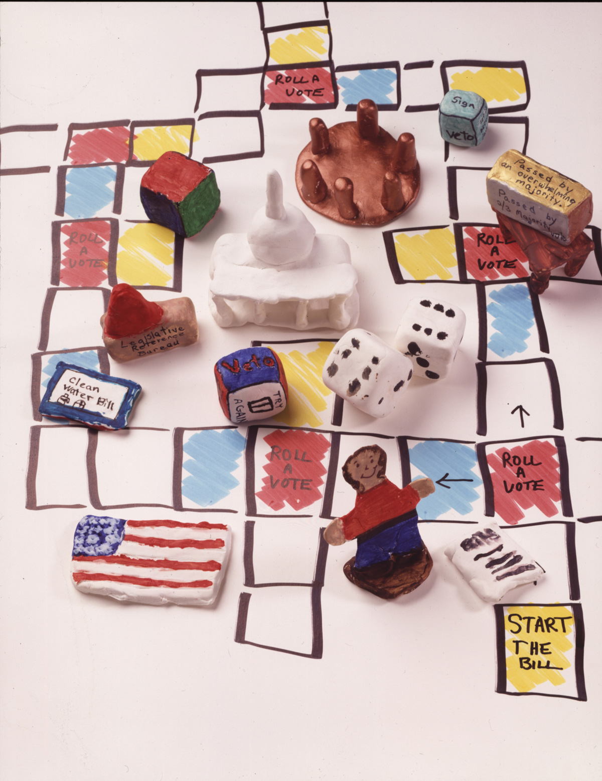 Designing games stimulates students' brains, enhances creativity, and creates memorable learning. Have students work in small teams to create a game based on some of the information they learned about the government. Encourage them to include steps that would enhance the game, such as opportunities to accept a challenge or take a risk. They can draw the game board on poster board and make the game pieces out of Model Magic.