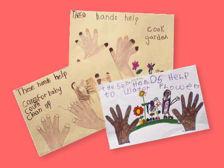 Have students help each other trace their hands on paper. Then ask them to color in the hands and illustrate a helping activity they perform. Have them (or help them) write down what their hands are doing in the drawing.