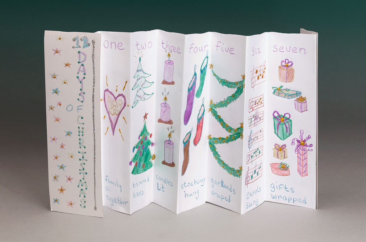 Ask students to illustrate a holiday song. They might choose to keep the original lyrics, or write new personalized ones that convey how they celebrate the holidays. They can write the traditional or new lyrics on an accordion-folded piece of paper and draw images to go with them.