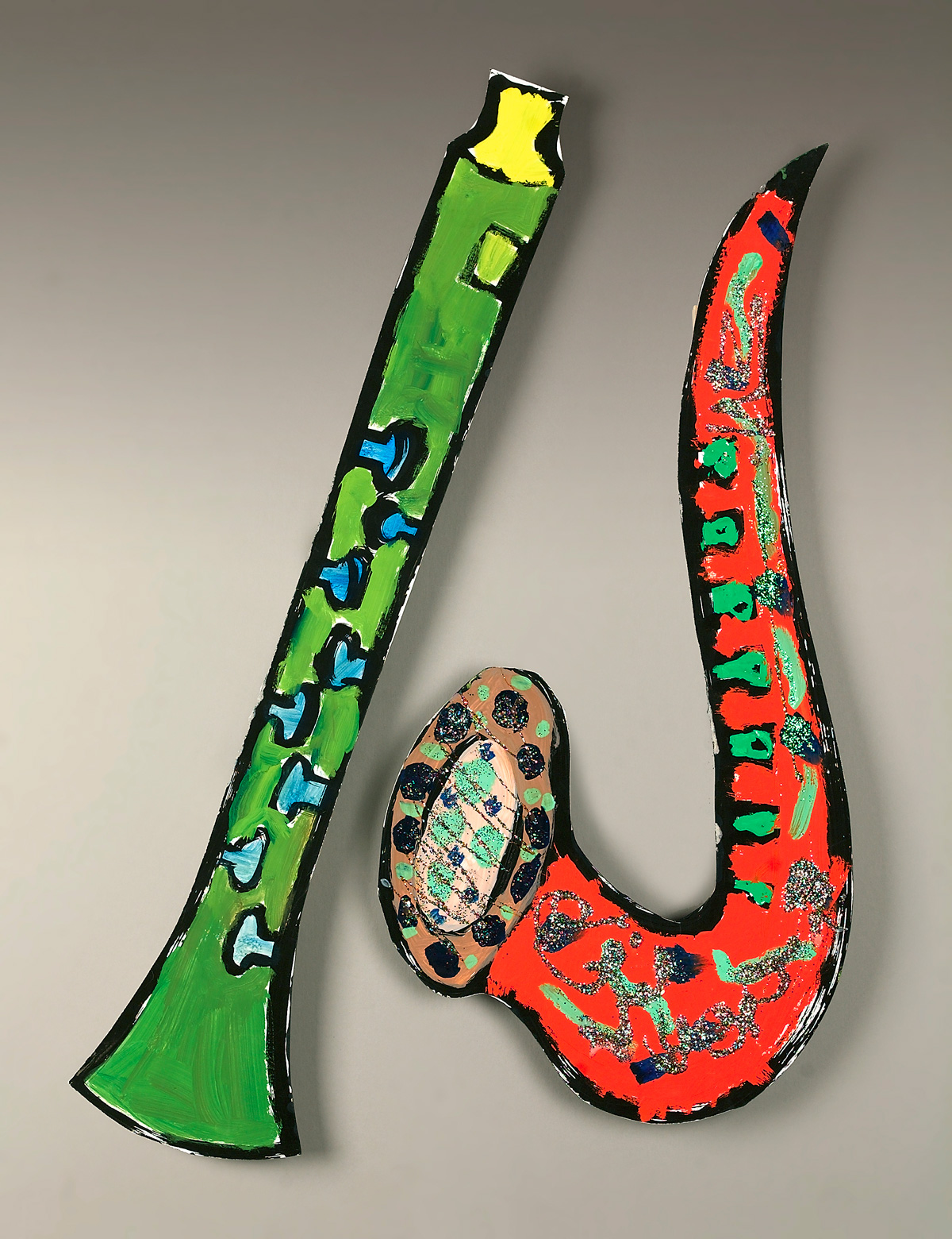 Ask students to create an outline of the chosen instrument on poster board as close to actual size as possible. Have them paint and decorate the instrument, adding glitter glue for those which appear shiny. When the paint and decorations are dry, have students cut the instrument out.