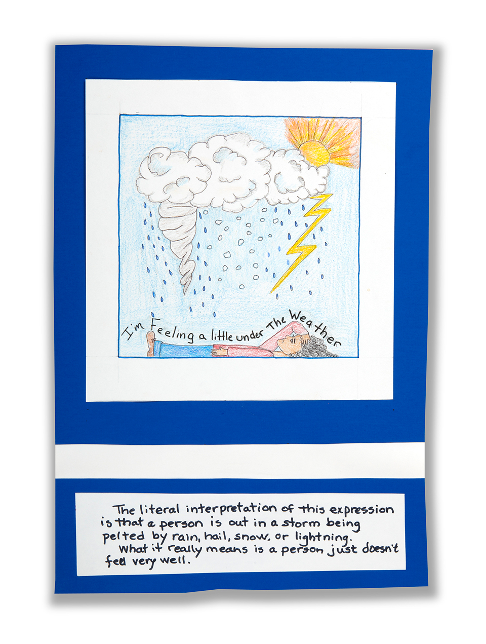 Have students depict an idiom literally. They can write it out and illustrate it on plain white paper and then glue it to a piece of construction paper, leaving room for a written explanation as to the intent of the idiom. Ask them to learn about the origin of the particular phrase.