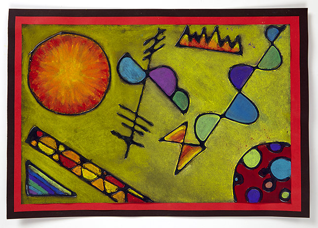 Display the finished works and discuss how the colors and shapes evoke different emotions in different students and stimulate our senses.