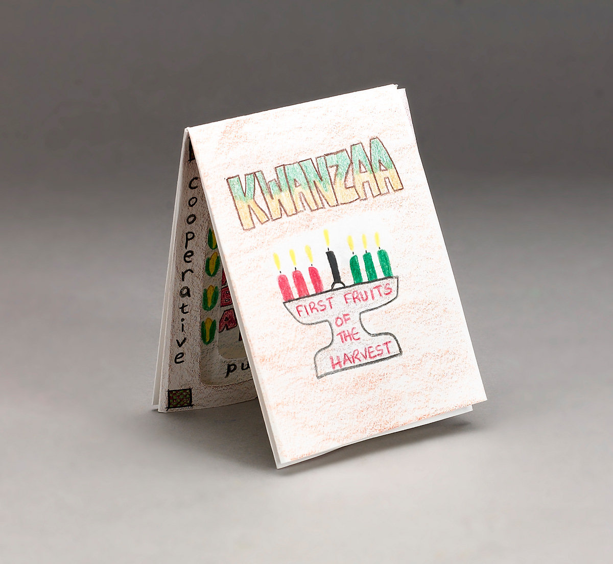 Have students create a window cut-out book to illustrate and display the Kwanzaa symbols. To begin have them fold thick paper and create a cover.