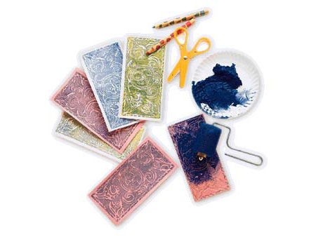 After a design is approved, determine the denominations (such as 5, 10, 20, etc.). For the printing process students will cut foam trays and emboss the surface with the point of a sharp colored pencil. Then they will sponge paint onto the surface to pick up the image. Press firmly on paper. Cut out the bills. (Note that the art will be a mirror image which can be a design challenge students tackle.)