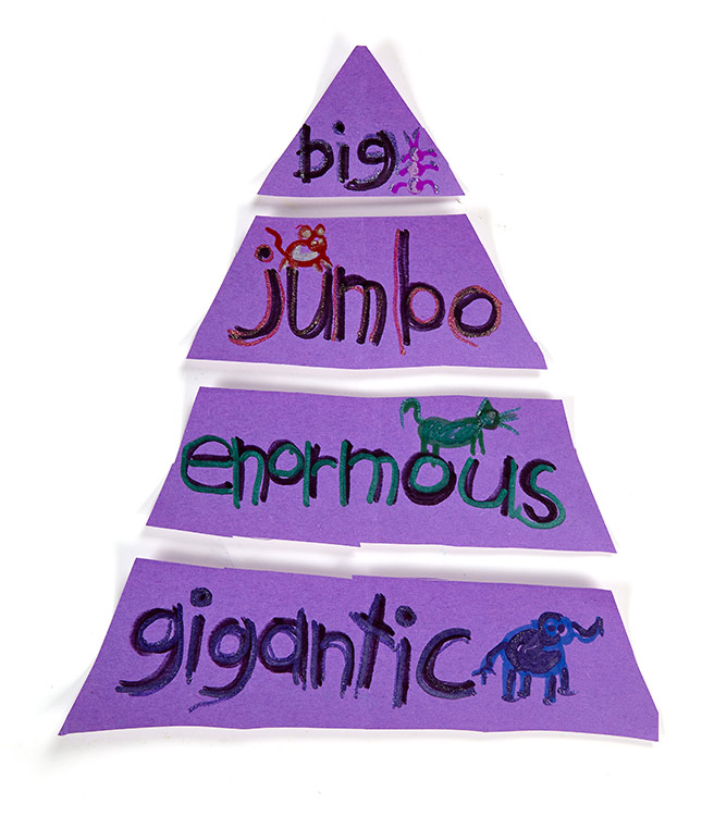 Have students choose a word and several synonyms for it to write and illustrate. Ask them to cut a piece of construction paper vertically into a triangle and then cut the triangle into three or four strips horizontally. Have them write their synonyms on each strip and add an illustration to it. Then have them arrange their words into a synonym tree.