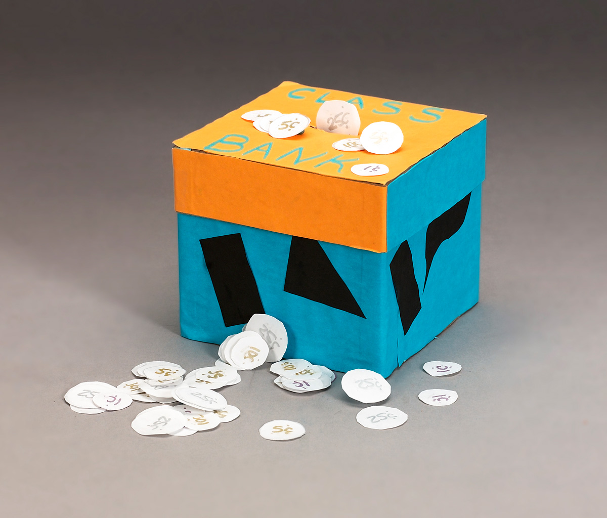 Have some of the students form a group that will  decorate a coin bank by covering a recycled box with construction paper. When each side and top of the box are decorated, one or two students can  glue the paper sheets to the box.