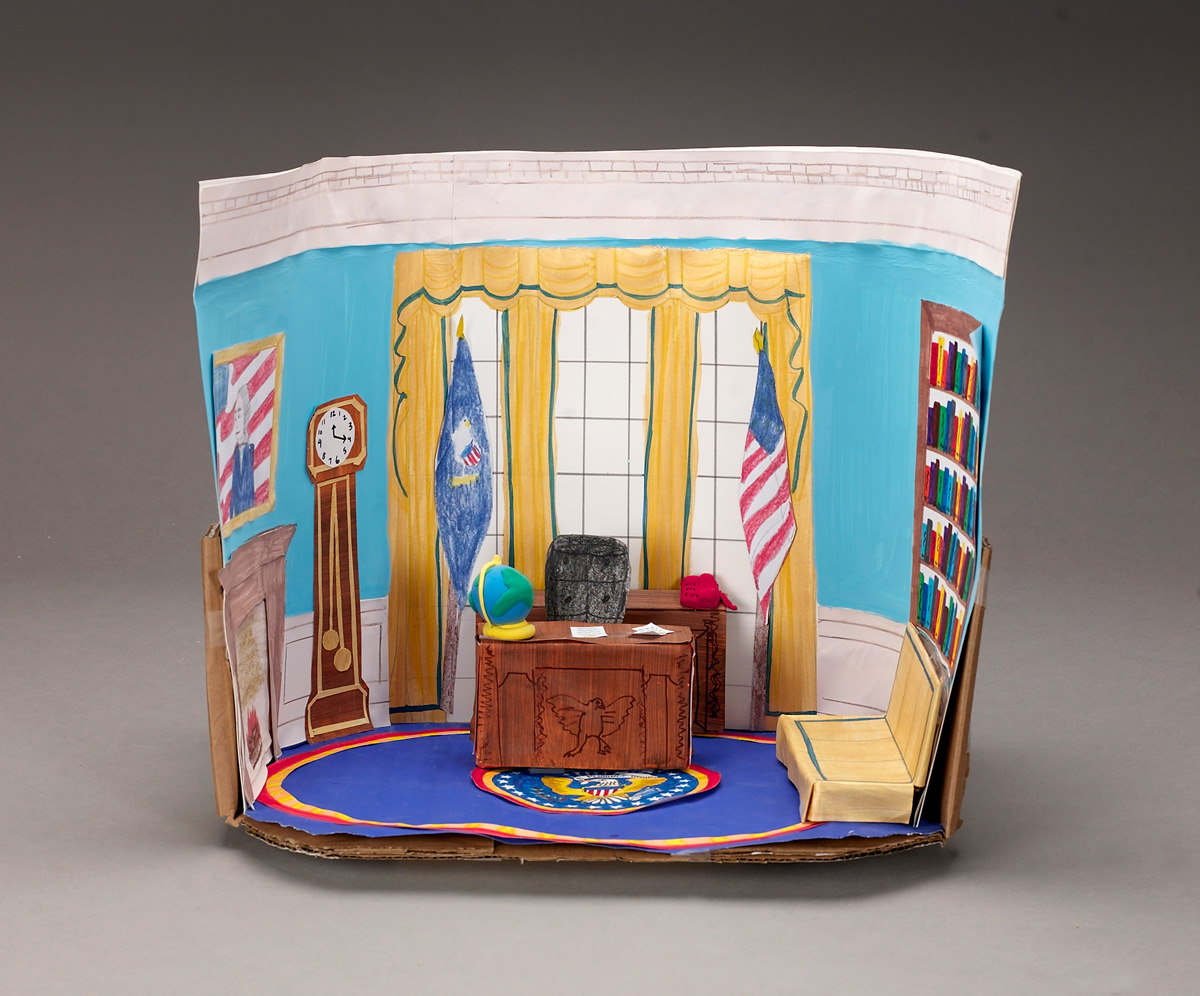 Ask students to create a miniature diorama of the Oval Office and add personal décor touches. They can stand an open box on its side to use as a base, then paint the background on paper and glue it into the box. They can create additional features, such as rugs, desk and chair, sofa, and other adornments, out of paper and Model Magic.