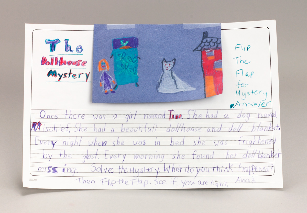 Challenge students to write a short mystery story. Have them write and illustrate it on heavy paper, and leave a blank space for the answer that they will hide with a flap. Have them cut a small piece of construction paper and draw images on it associated with their story. They will write and/or illustrate the mystery answer in the blank space, then tape the top edge of the illustrated construction paper over that area so that it can be flipped open to reveal the answer.