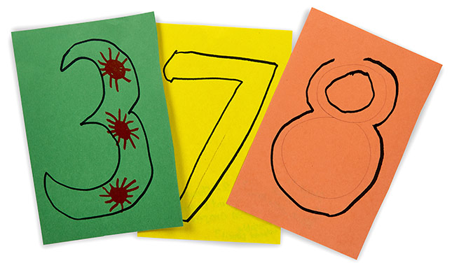 Ask children to review the numerals from one to 10 and then practice writing them. Then have them write "bubble numbers" from one to nine (several per sheet of paper). They can do this by first writing the numeral lightly in erasable colored pencil and then tracing around it with a washable marker to create an open version with room to illustrate inside. They may wish to erase the written pencil marks. Then they can cut out the sections to form their number cards.