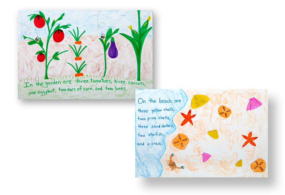 Younger students can create math sentences using the items in their drawing. Older students can create a math equations; for example, 3 tomatoes + 3 carrots + 2 ears of corn + 1 eggplant + 2 bees = 11 items in the garden.