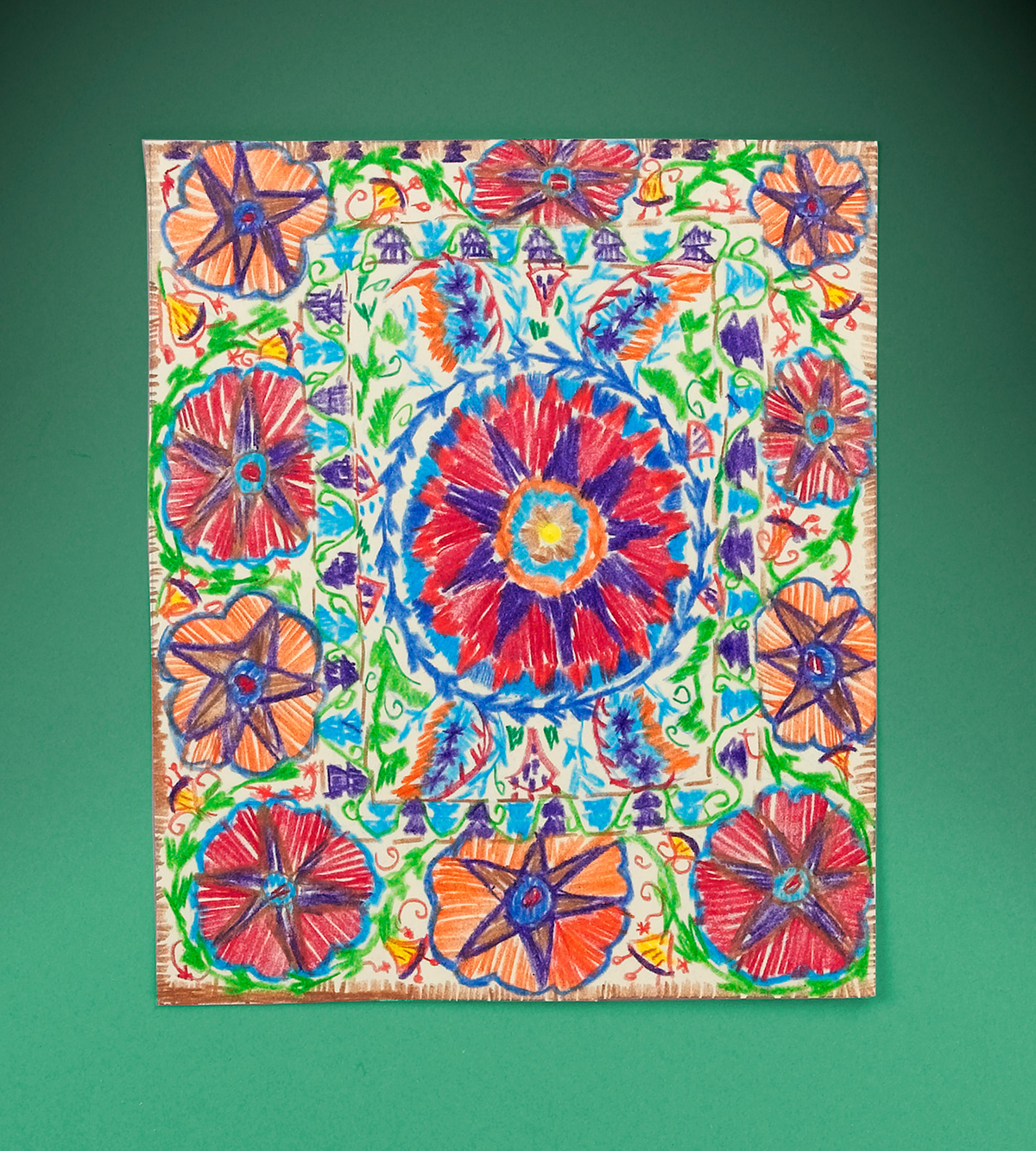 Ask students to use images of suzanis to inspire them as they draw a replica of a colorful suzani. Encourage them to use representative symbols and colors. For example, men were represented by cornflowers, women by poppies, etc.
