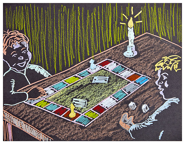 Ask students to think about what life might have been like before electricity. Have them think of activities families may have engaged in or what they might do if they had to live for a period of time without it. Then have them create a scene of an activity performed without electricity.