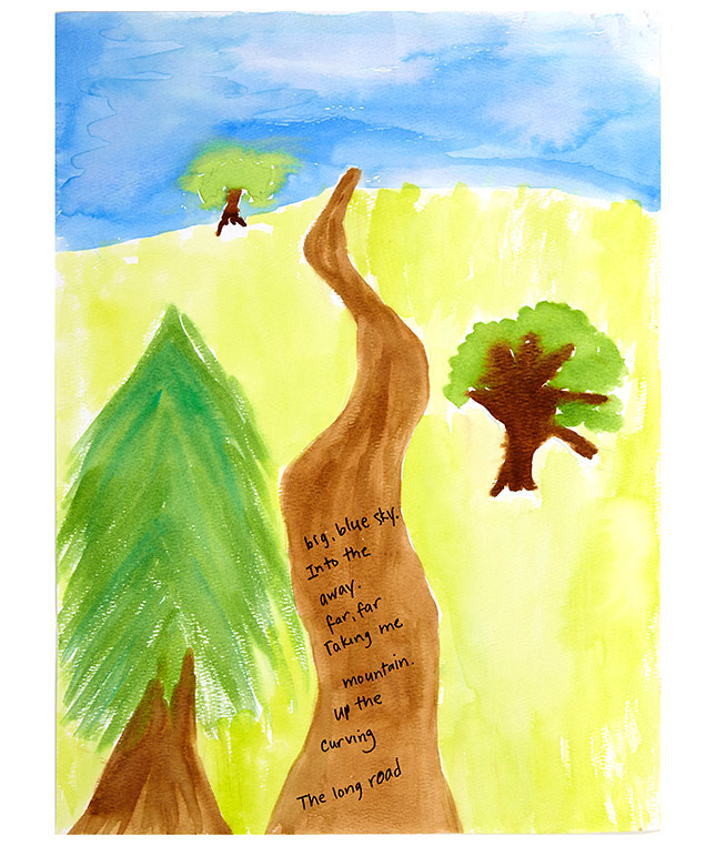Ask students to sketch a scene using the one point perspective technique and watercolor pencils. Then have them add water to the sketch which will become a watercolor painting. The can add more watercolor paint to increase the saturation of color in the scene. While the paint is drying have them compose a poem that evokes the feelings in the art. When the paint is dry, they can use marker to transcribe their poetry onto the scene.