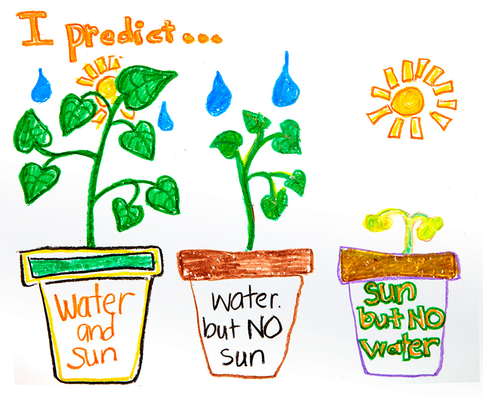 Ask students to predict what would happen if plants received both sun and water, just sunlight, or just water. Have them draw their predictions on a white board using either dry erase markers or dry erase crayons and label each drawing with predictions. How will the plants look that grow in each of these three conditions: sun + water, sun only, water only?