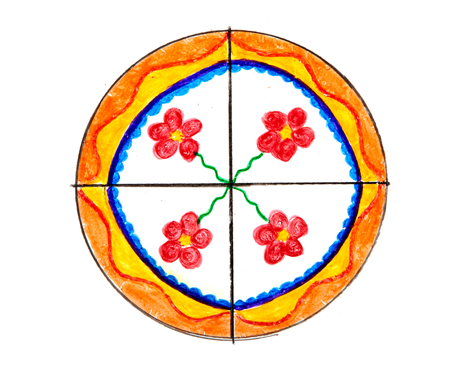 Ask students to create a radial design, either on a dry-erase board or using markers on plain paper. They can begin by drawing a circle, then divide it into four equal sections. Then they can create a design and repeat it in a symmetric pattern in each section.