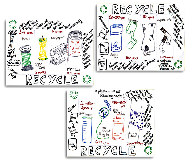 Have students work in pairs or small groups. Ask each group to pick an area to research, perhaps paper, electronics, glass, etc., and then design and illustrate a poster that presents information about that topic.