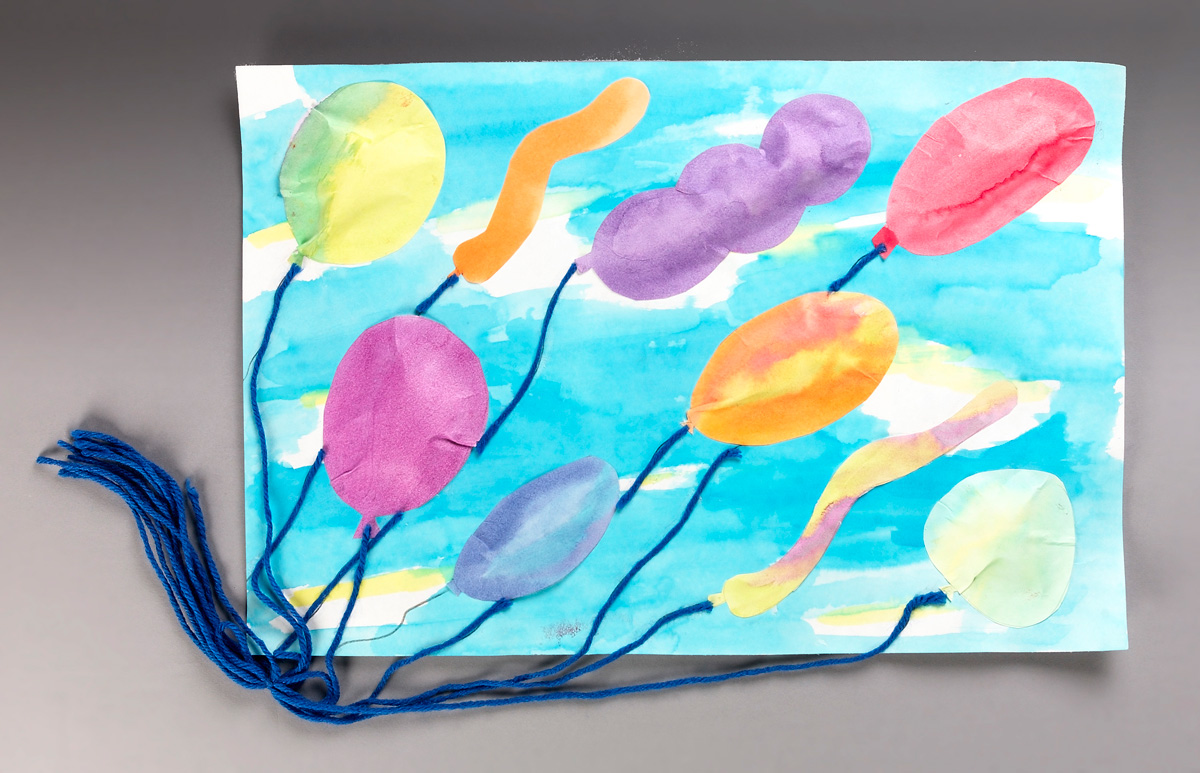 Cut out the balloons using Crayola Scissors. Glue one edge of each balloon onto the sky background with Crayola Glue Sticks. Stuff balloons with tissues and then glue down the other end. Glue on pieces of colorful yarn for balloon strings.