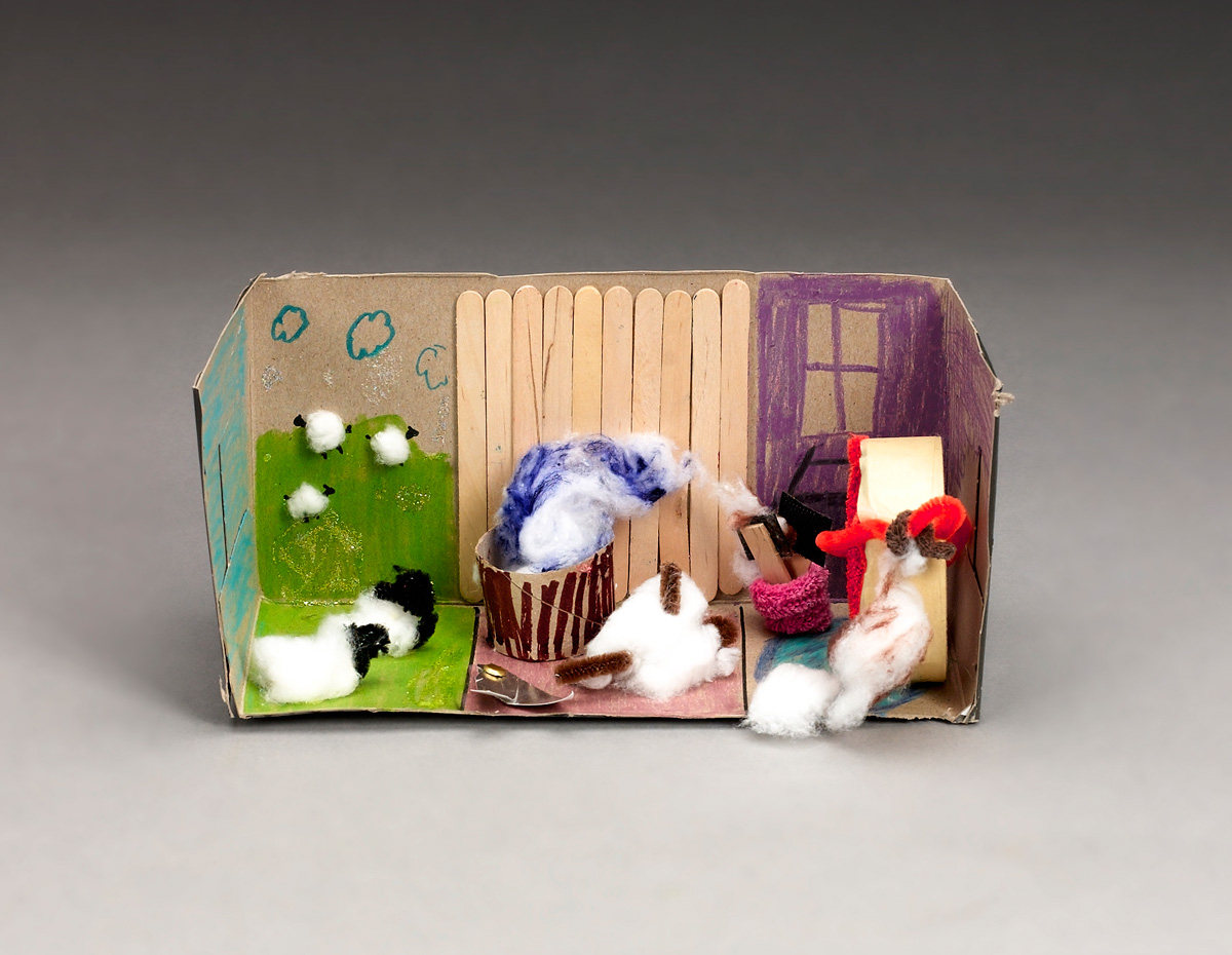 Have students create a diorama depicting sheep, sheep shearing, the weaving process, or a combination. A recycled box can serve as the base, which can be illustrated with markers. Cotton balls can be used to construct the shape or the sheared wool, craft sticks might be used for a loom, and chenille sticks could be the sheep's legs.