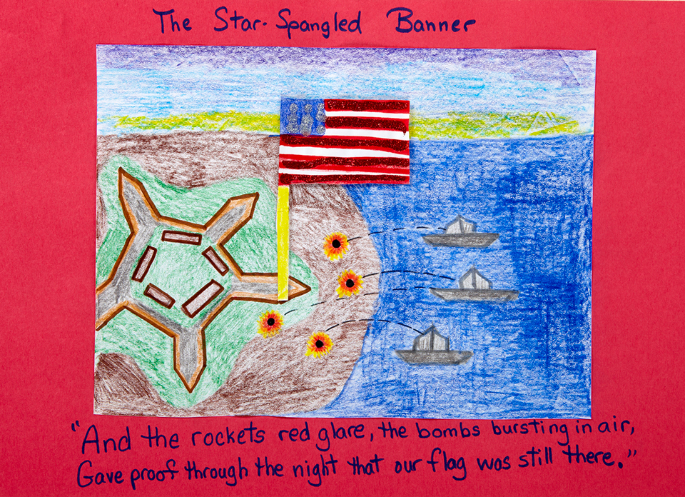 Have students look at images of the Great Garrison Flag, which is now on display at the Smithsonian's National Museum of American History. Have them also read through the full version of The Star Spangled Banner, which actually has four verses. Have them choose a line to illustrate. They can create the illustration on white paper and glue it onto a larger piece of construction paper. Ask them to write the lyrics they illustrated around the illustration on the background paper.