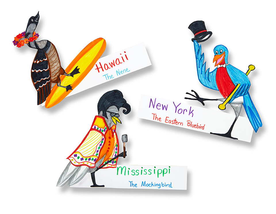 Have students explore the official bird of each state, then have each student choose a different state bird to research and illustrate. They can learn about the bird's habitat, migration pattern if any, diet, etc. Have them sketch the bird on heavy paper, then decide how the bird will be portrayed to represent the state. For example, they might illustrate a brown pelican, the state bird of Louisiana, wearing a Mardi Gras mask and beads. Have them leave space at the base so they can write the name of the bird and the state it symbolizes, then cut the bird out.