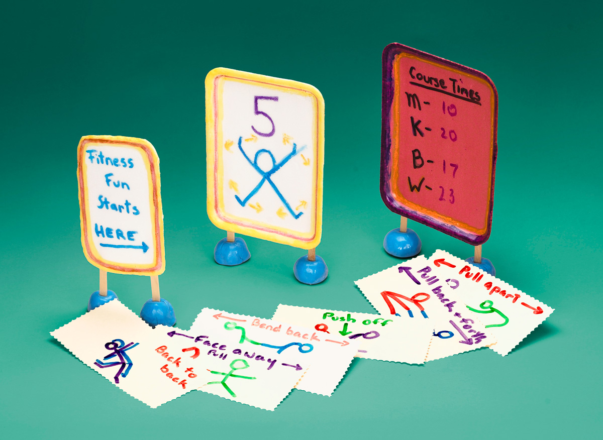 Ask students to choose a partner to work with. Have the pair design a workout routine that they will follow together. Then ask them to create visuals to inspire them. They might write and illustrate each exercise on an index card and display reminders or benefits of physical exercise that they display in the classroom. They can glue craft sticks to their index card signs and then insert the stick's ends into stands made out of Model Magic.