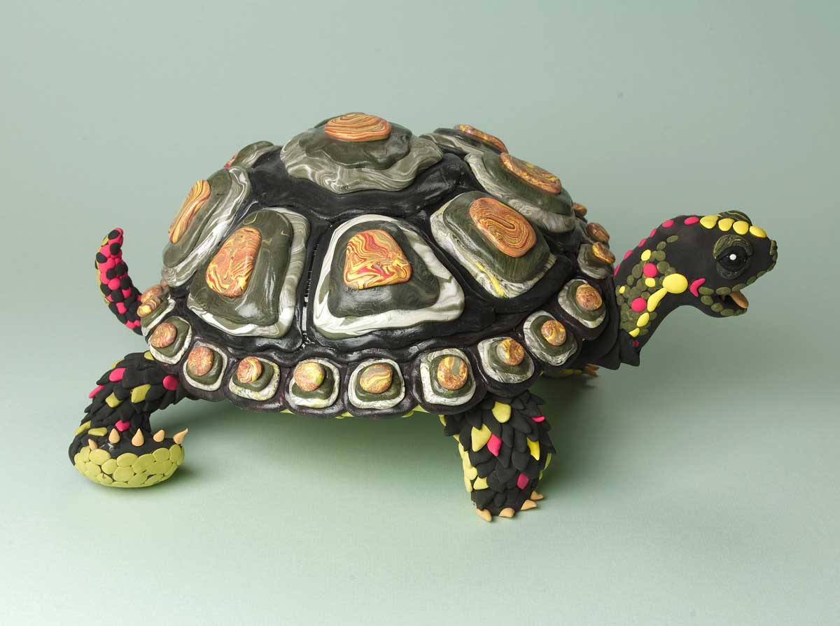 To begin they can create an armature base by crumpling newspaper on top of cardboard to form the body and shell of the tortoise. They will then cover the armature with a thin layer of Model Magic. They can create the scutes, the protective scaly shields, out of individual pieces of Model Magic which will stick to the Model Magic base if  both are still moist, or they can be glued together if the Model Magic is dry. Students can then complete the tortoise by sculpting legs, a neck, a head, and a tail. To give the shell a shiny look they can glaze it by mixing glue with water and using a paint brush to paint over the shell.