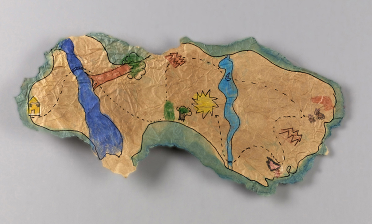 To make their map look like it is old, students can start by tearing a shape out of a brown paper bag, moistening it with water, crumpling it up, then spreading it out flat. When it's dry they can illustrate landmarks of the region and draw  a route to the location of the special place or "treasure."