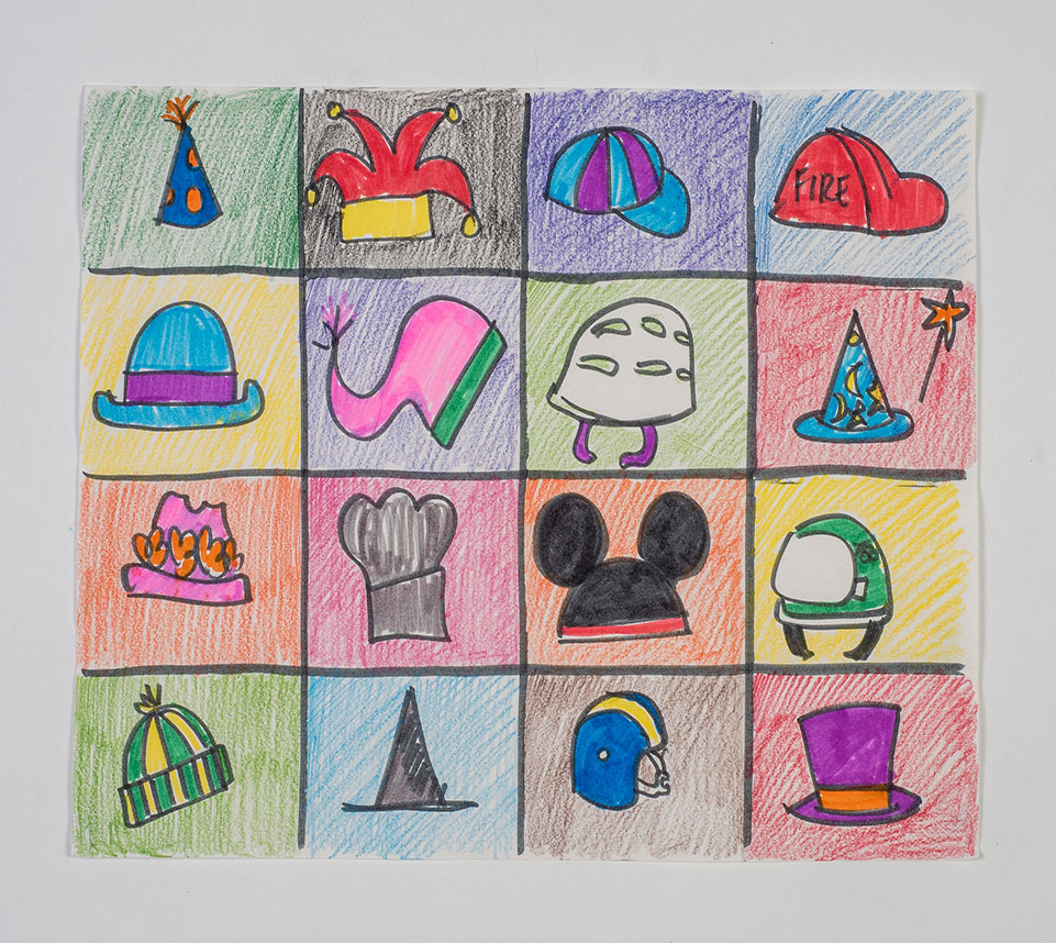 When older students help younger students it is beneficial for both age groups. Older students ask younger students to brainstorm a list of themes they could use to build a language game. This could be "Hats" (as illustrated in the lesson plan image), "Fruit," "Vehicles," or any other topic. Form small groups with several older and younger students working together to create a game they can play to address the younger students' literacy goals. They could work together over several sessions or the older students could design the game boards and bring them back to the younger students when the games are ready to play. The game boards would be designed by subdividing a piece of heavy paper into as many squares as needed. If they chose "fruit," for example, and came up with 12 different types, the board would have 12 squares. As they draw the images on the game board, they will repeat each of those images on an individual square that will be a piece for the matching game.