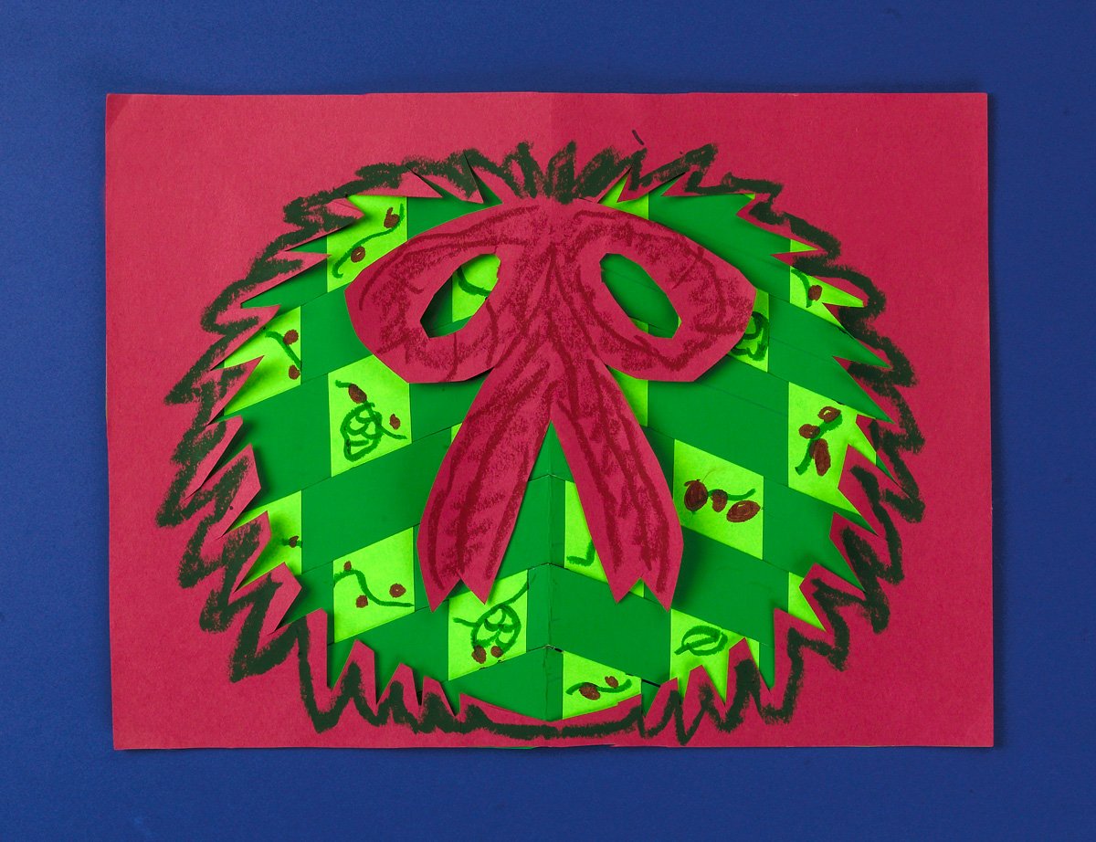 Have students create a woven wreath using construction paper and construction paper crayons. They might choose colors associated with Christmas and decorate it with symbolic images, or they could choose another holiday or occasion. They could, for example, use shades of yellow, brown, orange, and red to make a fall wreath. They can begin by drawing cut lines every inch or so on a piece of construction paper, leaving about an inch on each end to keep the pieces whole. This will be the base. They can then cut weaving strips from another piece of differently colored construction paper that are the same width, but these lines will go to the paper's edge so the result is many one-inch strips.