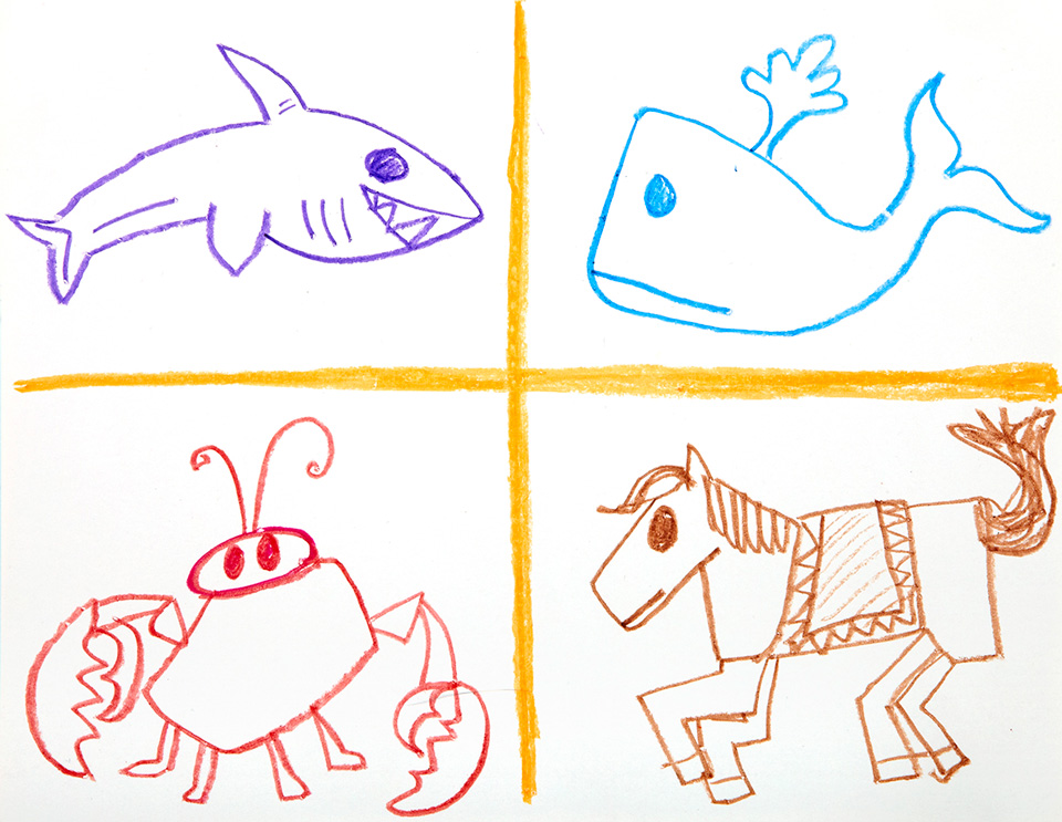 The benefit of using dry erase crayons is that children could quickly remove one of the objects and add another replacement to form another type of group. For example, looking at the example art, ocean dwellers could represent the group of three, and the horse doesn't belong. But if the whale and fish were blue and the the horse was erased and replaced with a blue car, the unifying group could be the color blue, and the crab wouldn't belong.