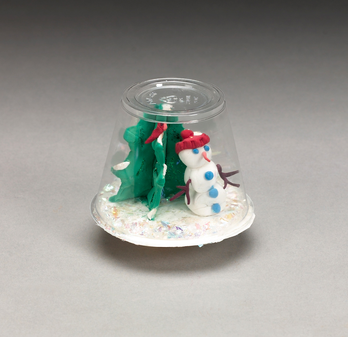 When the Model Magic objects are complete, students will work on the snowflakes and keep them to the side until they are ready to assemble the globe. Snowflakes could be made from tiny bits of Model Magic or from tiny cut scraps of cardboard or scrap paper. If made from moist Model Magic, be sure the main figures/scene and flakes are dry before adding the flakes to the scene. When students feel they have prepared enough snowflakes, they can lay them on the base carefully and then place the cup upside down over the entire scene. Glue the edge of the cup to the cardboard base. When the glue is dry, they can shake their globes and watch the snow fall and scatter.