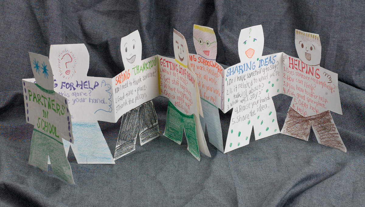 Have students form teams to brainstorm some of the many ways the class collaborates to achieve goals. Then have the team members create paper figurines of themselves (each a standard height and cut out so they can be taped together as a chain). Each student can write one of the ways they collaborate on their figurine, for example, "Sharing Ideas," then ways to achieve it could be: "Respecting others," etc.