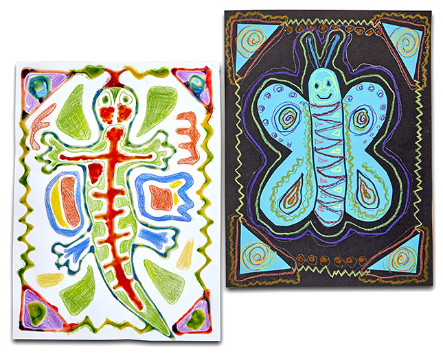 Students might choose to make a mixed-media piece using tinted glue, which is a combination of watercolors and white glue that they would draw with. The use of colored pencils, construction paper crayons, and different colors of background can demonstrate how this art technique can be varied.