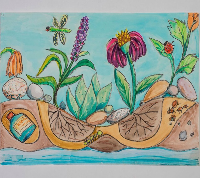 Students apply their knowledge of living things above and below the ground in artwork that shows an ecosystem.