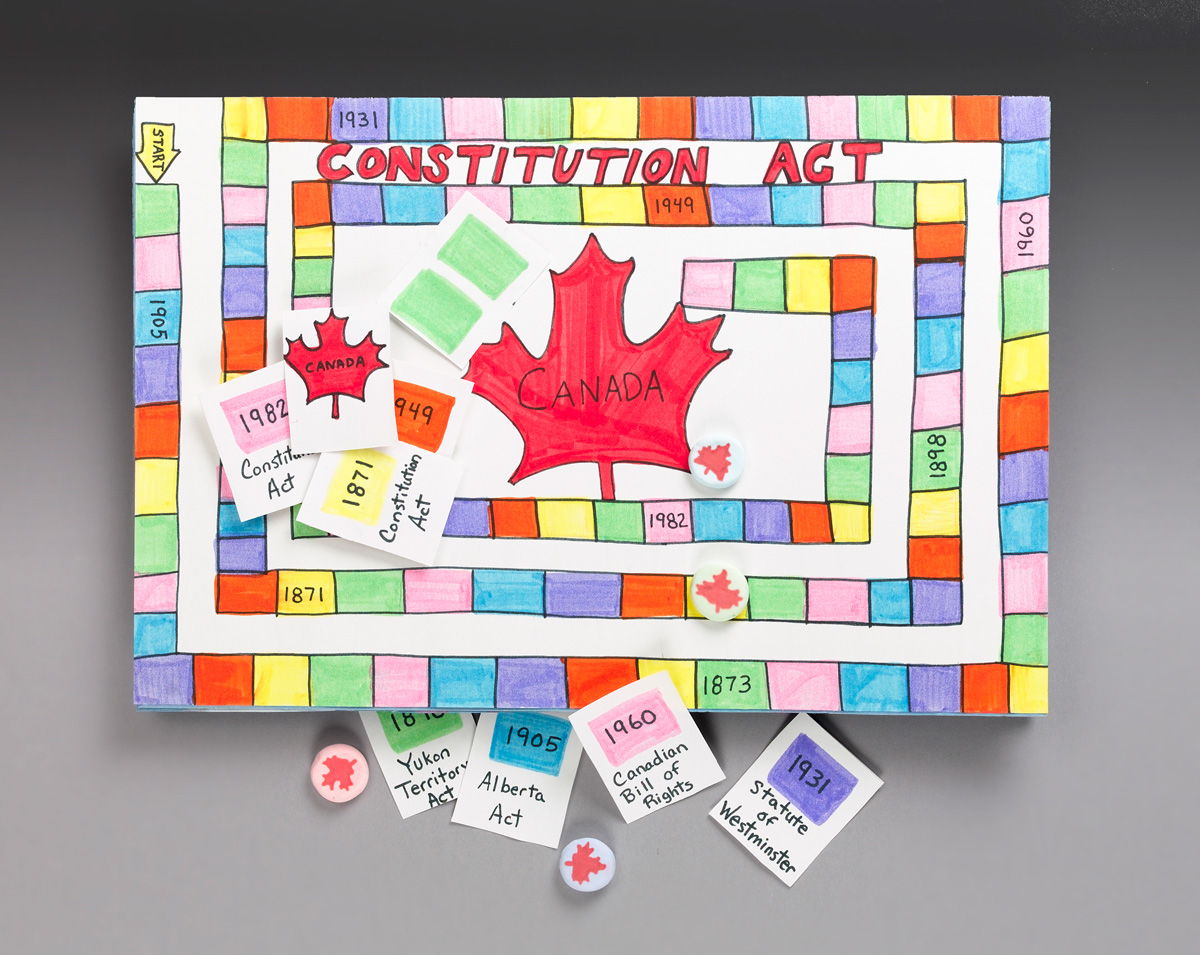 Have students divide into small teams to create a board game that teaches some facts about Canada's constitution and history. Have them decide what information to include and specific rules and game play for the game. Will it be played by individuals or teams? Will there be challenges and opportunities that advance or stall players? Even the design of the board should be planned. It can be linear or provide alternative paths. Determine if players will roll dice or draw cards as part of the game play.