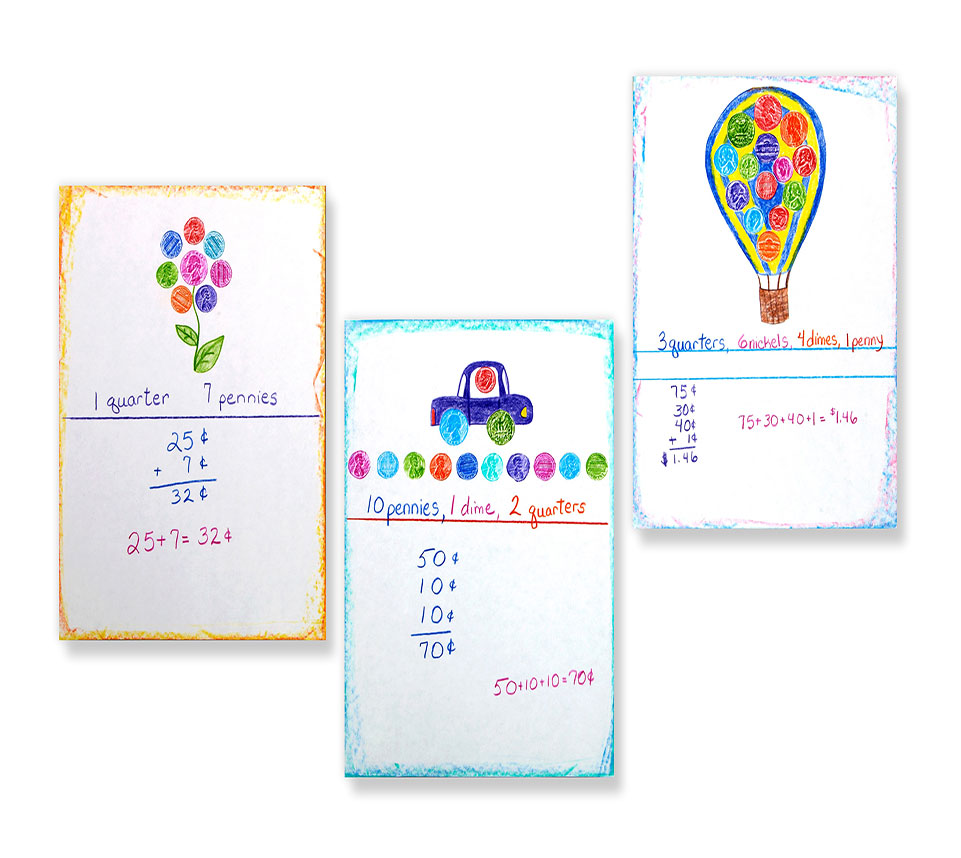 Students will need one of each coin. Have them place the coin under a piece of white paper, then use a colored pencil to rub over it until the coin's design appears. They should create as many rubbings as they'll need to create a picture they decide to make. After they make their coin rubbings, they will cut them out, arrange them into a picture, and glue them onto another piece of paper. They will list how many of each coin they used in their art and create an addition equation that aligns with the coins depicted.