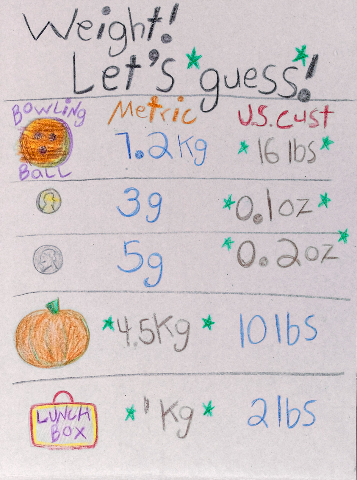 As they look up the actual weights (in both U.S. customary units and metric units) they can erase any inaccurate guess-timates and modify their illustarted list to show how these two sets of measurements compared.