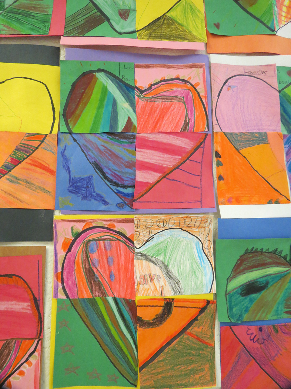 When the sharing is complete they will each have uniquely decorated hearts. They will glue the four different designs together on heavy paper, making sure they each have a left and right pointed end and a left and right rounded heart top. Have a discussion about how collaborating and combining different styles can create a more visually appealing and emotionally powerful work.