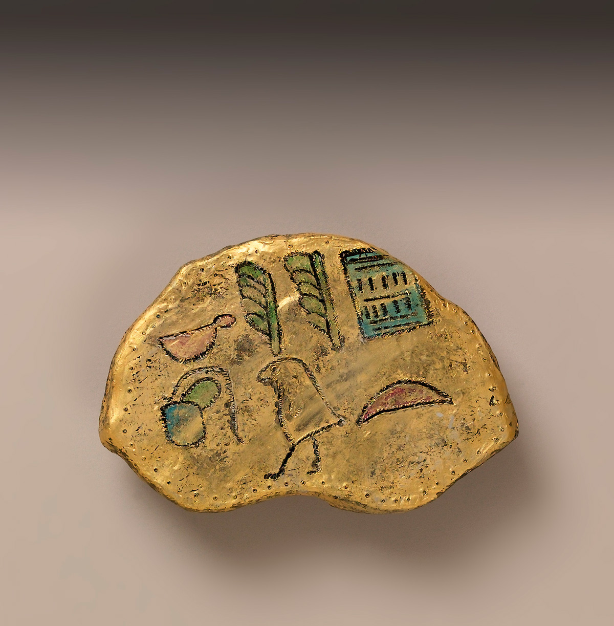 Have students make their cartouche, a structure often in the shape of an oval or oblong used as an ornament or to display an design or message, out of a flattened ball Model Magic. They can press it into any shape and then use the pointed tip of an unfolded paper clip to etch the characters into the Model Magic. Have them add color with markers or paint, then embellish the entire shape with a light coat of gold paint.