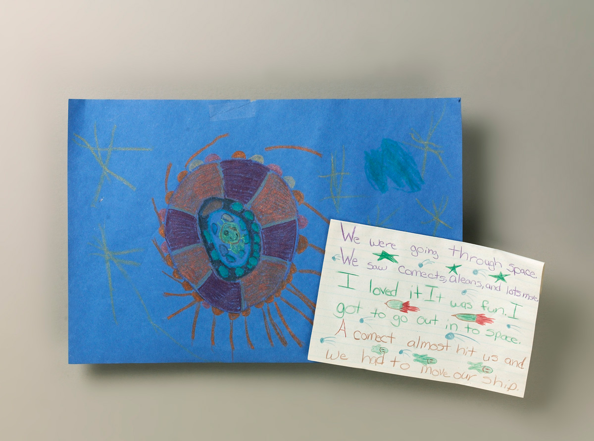 Ask students to write a brief story imagining a themselves journeying in space. What sights might they see? What if they encounter life on other planets? Have them illustrate themselves in a spaceship or on an imaginary space journey. They might want to draw a picture of their family displayed in the spacecraft. This demonstrates how space travelers can look out at the wonders around them and at the same time enjoy reflecting on their family back home.