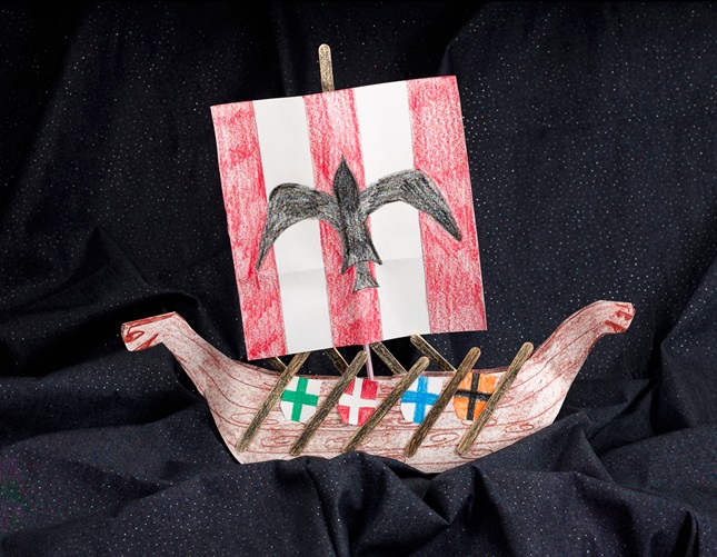 Have students look at images of Viking longships, which were often adorned with a carved dragon or serpent head at the bow. Then ask them to use these images as inspiration as they create a Viking longship. They can cut the ship out of heavy paper, then embellish it with symbolic images such as the dragon or serpent head and the circular shields on the sides. Craft sticks can be used as the oars and also as the mast for the flag.