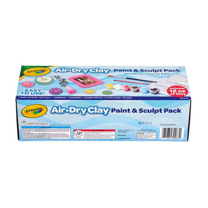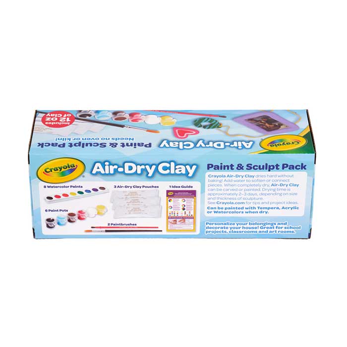 • CRAYOLA PAINT AND SCULPT KIT: Features (3) 4oz packs of Air Dry Clay, a Red Pony Craft Brush, a 6‑count Washable Paint Pot set, and an 8‑count Oval Watercolor Paint Pan with brush—all the essentials for sculpting and painting in one creape kit.