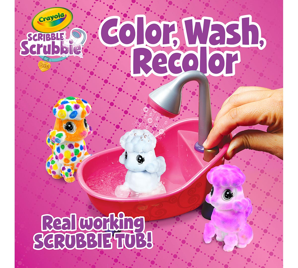 • Color, wash, re-pet! Crayola Scribble Scrubbie Pets are adorable, colorable, and washable pet figures that little would-be groomers can customize again and again! This pack includes Francesca (dog), Scooter (dog), Peach (cat), and Clyde (bunny). Choose a pooch, get smitten with a kitten, or make your bunny funny and color with the 6 included Scribble Scrubbie Washable Markers. After you're done with a look, pop them in the Scrub Tub and wash clean with the included Scrub Brush. Create new colorful coats as often as you like! Additional expansion packs sold separately. Collect them all!